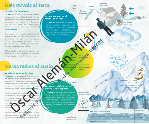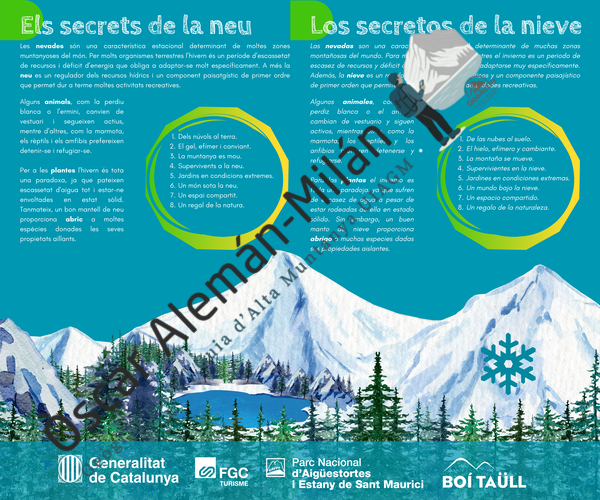Descripció: Exposició bilingüe (català i castellà) que explora la neu com a fenomen ecològic i paisatgístic. S’hi expliquen les adaptacions d’animals i plantes a la neu, la importància del període hivernal per als ecosistemes, i curiositats sobre el gel i la superfície nevada.